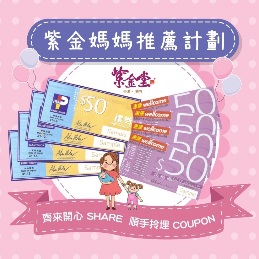 4. 活動完結後,本公司將會核實所有資料並通知推薦人,推薦人可選擇到「紫金堂港澳」葵芳門市領取超級市場禮券,或以平郵形式寄出,郵費將由紫金堂支付。