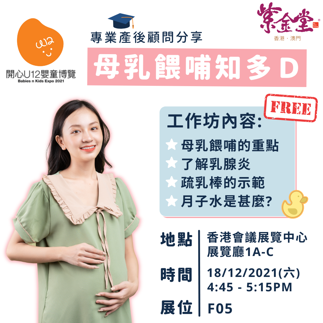 除了兩場講座【紫金堂】亦有參展,會場F05 展位提供多款皇牌養生食療,男女老少都岩用。當然唔少得坐月30天組合同母乳調理產品,歡迎到 開心U12嬰童博覽 選購!