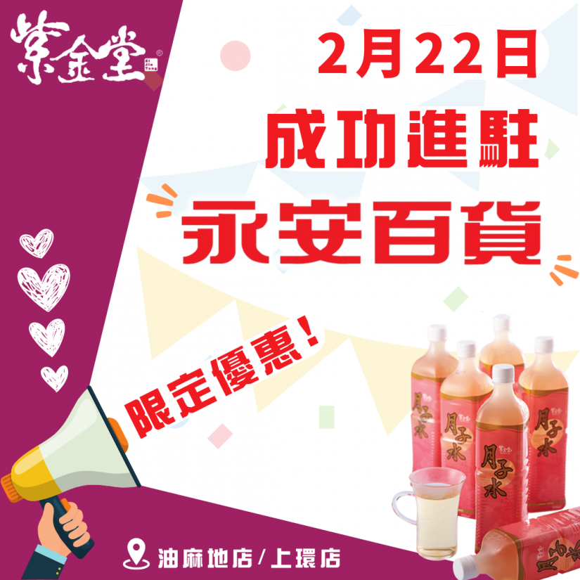 【紫金堂】於 2022年2月22日進駐香港永安百貨,分別於油麻地店 及上環店嬰兒部,提供坐月食療、月子水、功效性代茶飲品、產後用品、經期調理等,而由即日起至2月28日,所有產品將有9折優惠。限定優惠,快D把握機會,仲唔快啲嚟掃貨!